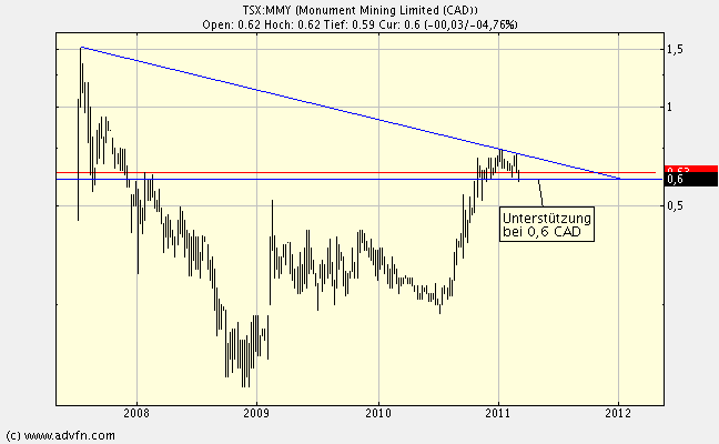 Charttechnisch könnte sich Monument, wie digg17 beschrieb, in einem Seitwärts-Range bewegen. Die Aktie hat am Freitag in Kanada wieder die Starke Unterstützung bei 0,67 CAD erreicht und könnte den Doppelboden in Frankfurt (#3302 ) bestätigen und eine einen Wendepunkt darstellen. Es ist auch möglich, dass die Aktie noch einmal die 0,6 CAD testet, bevor sie sich wieder in Richtung 0,7 CAD bewegt.