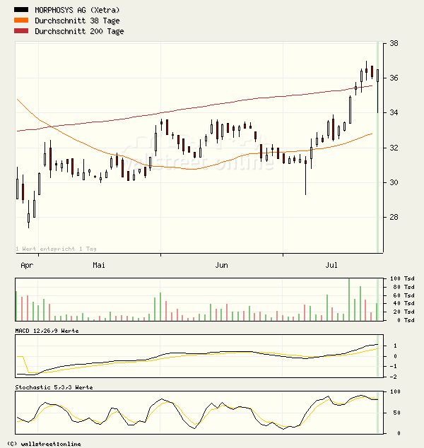 Die Morphosys-Aktie markierte ihr Allzeithoch Anfang 2000 bei 444,44 Euro. Anschließend setzte, wie bei fast allen Werten des ehemaligen Neuen Marktes, ein rasanter Kursverfall ein, der das Papier Ende 2002 auf ein Tief von 4,69 Euro sinken ließ. Von dort aus gelang nach einer etwa einjährigen Bodenbildungsphase die Etablierung eines neuen Aufwärtstrends, dessen bisheriger Hochpunkt sich im November letzten Jahres bei 46,70 Euro befindet, wo die Kurse an einen Widerstand stießen. Dieser starke Kursanstieg wurde sodann in den letzten Monaten korrigiert und führte die Notierungen auf 27,40 Euro zurück. Im kurz- bis mittelfristigen Zeitfenster ist nun die Ausbildung einer asymmetrischen (schrägen) Doppeltief-Kaufformation von Interesse. Der entsprechende Durchbruchspunkt (Kauf-Trigger-Linie) befindet sich bei 33,64 Euro und konnte am Dienstag/Mittwoch überwunden werden. Dieser Durchbruch wurde von einem auffällig hohen Handelsvolumen sowie einer großen Handelsspanne begleitet, was die Signifikanz bzw. die Qualität dieses Kaufsignals aus technischer Sicht erhöht. Die markttechnischen, trendfolgenden Indikatoren weisen ebenfalls einen positiven Gesamteindruck auf. So konnte der MACD-Indikator (Moving Average Convergence Divergence – Signal für überkaufte und überverkaufte Situationen) auf Tagesbasis mit dem jüngsten Aufschwung den Abstand zu seiner Signallinie nach einem Kaufsignal vergrößern. In dieser Woche könnte zudem der entsprechende Indikator auf Wochenbasis nach fast einem Jahr wieder ein Kaufsignal generieren. Ferner spricht auch die steigende gleitende Durchschnittslinie der vergangenen 200 Handelstage, an der sich die Kurse derzeit befinden, für eine positive Erwartungshaltung im Hinblick auf die mittelfristige Kursentwicklung.