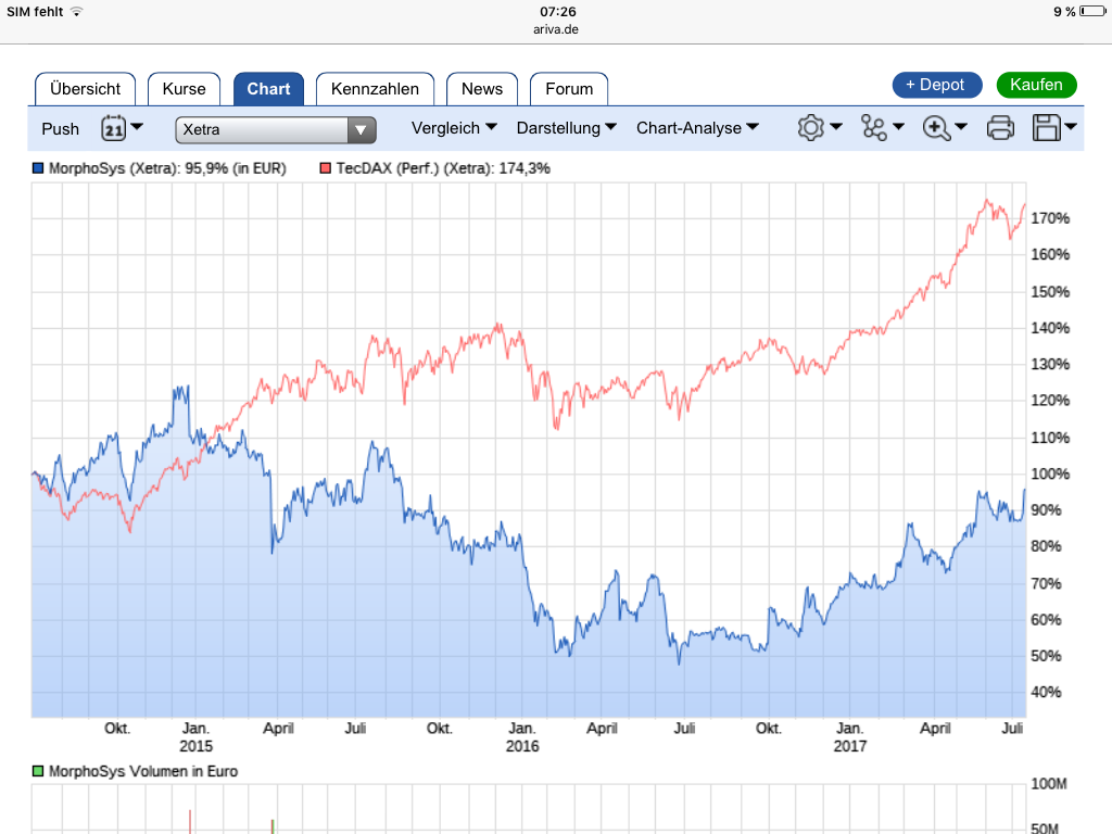 Noch was: Schaut euch mal Analysen von amerikanischen Banken für amerikanische Biotechs an. Da werde irrwitzige Summen ausgerufen. Also umgerechnet, soll so manche Biotechfirma 1 Mrd. wert sein, obwohl sie 2 - 3 Medikamente in Phase II oder davor noch in der Pipeline haben. Also ich denke, Dividende hin oder her: MOR ist die besser BBB. Die Amis sind doch nur neidisch, wenn sie über den großen Teich schauen müssen, um zu sehen wie Biotech geht.