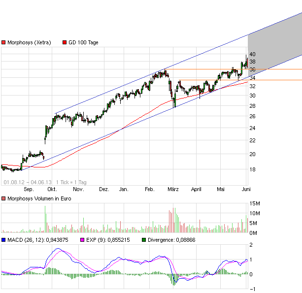 05.06.2013 (www.4investors.de) - Unter den TecDAX-notierten Werten fällt am Mittwoch vor allem die Morphoys-Aktie auf. Das Biotechpapier liegt gegen 15 Uhr mit rund 4,5 Prozent im Plus bei 38,31 Euro, das Tageshoch wurde am frühen Nachmittag bei knapp 38,80 Euro notiert. Die seit mittlerweile rund einem Jahr anhaltende Hausse des Titels, die an der 16-Euro-Marke begonnen hat, bleibt damit weiter intakt, auch wenn die Aktie mittlerweile an zwei Tagen in Folge spürbar unter dem Montag notierten Verlaufshoch bleibt – dieses ist bei 39,75 Euro verzeichnet.