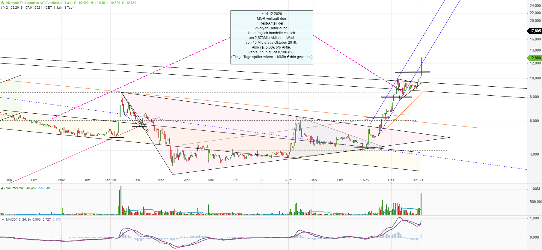 Der Kurs von Vivoryon dreht weiterhin durch. MOR hatte die Beteiligung ja Mitte Dezember gänzlich verkauft. Gewinn aus dieser Beteiligung fast 8Mio.€ . Hut ab, dafür, dass der Vivo-Kurs beinahe die ganze Zeit unter dem Beteiligungspreis (ca. 5,60) lag.