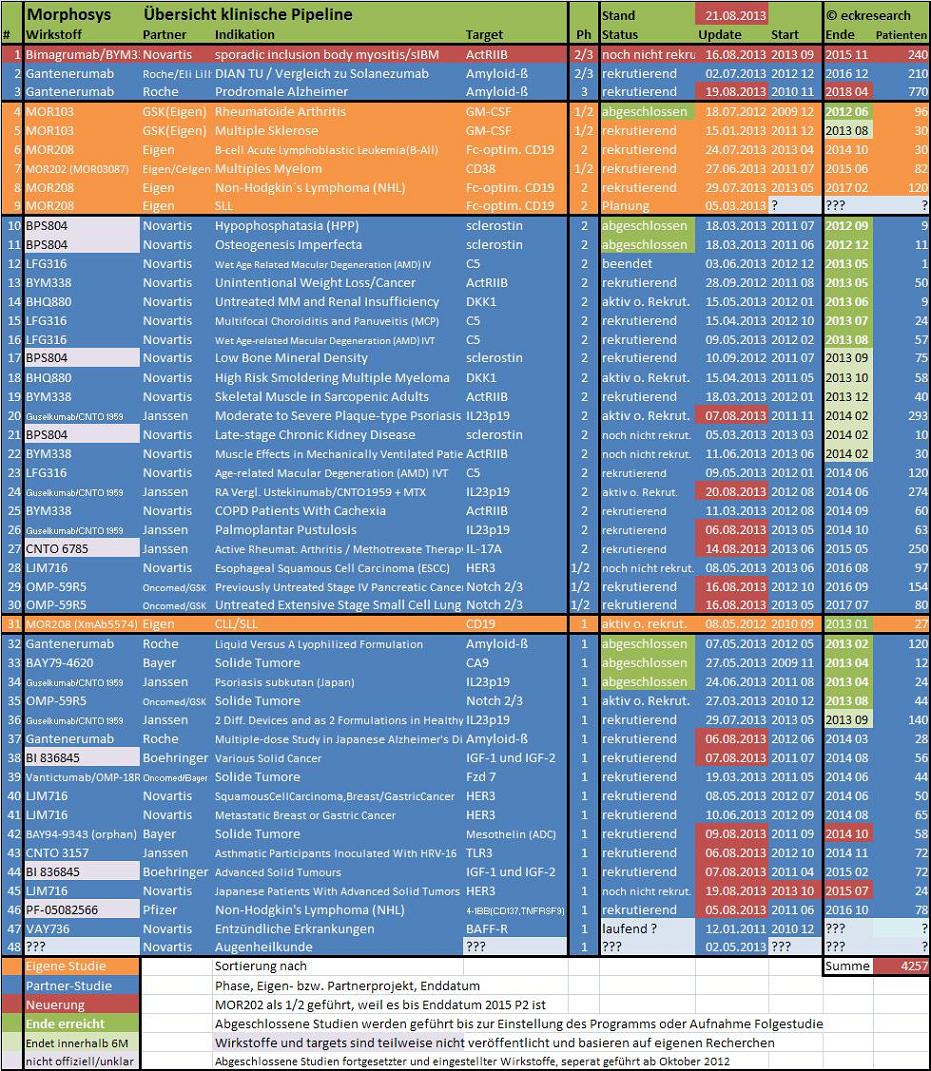 Die weiteren Indikationen habe ich rot markiert. Es ist ausdrücklich die Zulassungsstrategie von Morphosys ein Medikament nicht unbedingt zuerst in der Umsatzträchtigsten Indikationen zu entwickeln, sondern in der aussichtsreichsten und das schnellstmöglich. Später kann dann bei laufenden Umsätzen die eine oder andere Indikation nachgezogen werden, aber das Kostenrisiko trägt dann bereits die erste Zulassung.