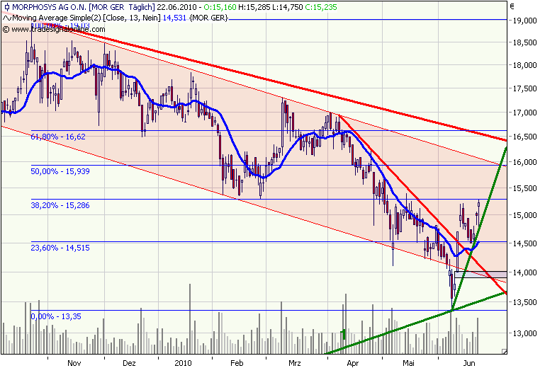 Anleger, die der AKTIONÄRs-Empfehlung gefolgt sind, wurden Anfang Juni bei 14 Euro ausgestoppt. Kurz unter diesem Niveau drehte der Kurs, und die Aktie startete mit einer Erholung bis in den Bereich 15 Euro. Der AKTIONÄR bleibt aber dabei: Das Morphosys-Papier ist ein Basisinvestment unter den deutschen Biotechs. Ein Einstieg sollte sich lohnen. Das Kursziel für den Titel bleibt bei 25 Euro. Ein Stoppkurs bei 12,20 Euro sichert einen Neueinstieg nach unten ab.