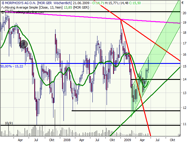 Denn die MorphoSys Aktie, im Jahr 2008 noch die beste Aktie im TecDAX, lief in diesem Jahr bisher nicht so gut und daher erwarteten wohl viele das die Kursrally spätestens am GD200 bei etwa 14,80 Euro wieder zu Ende sein würde. Doch weit gefehlt, unter recht hohen Volumen knackte die Aktie gestern diesen Widerstand problemlos und generierte damit ein weiteres starkes Kaufsignal.