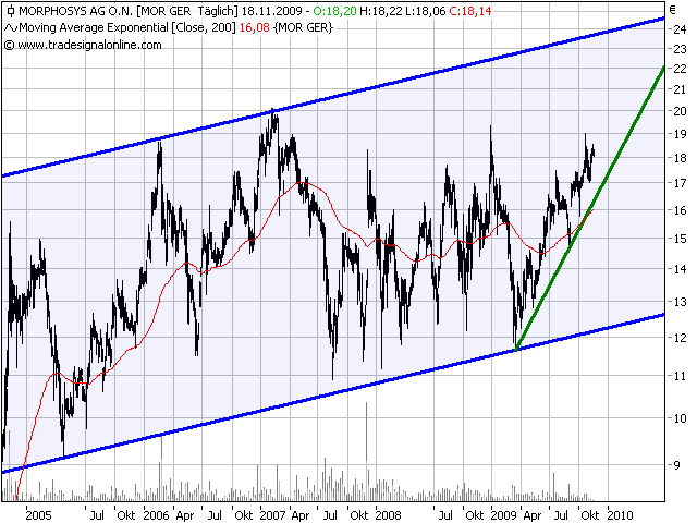 Wer sich für Biotechs interessiere, für den sei MorphoSys ein Basisinvestment. Die Marktkapitalisierung sei sogar mit über 140 Mio. EUR Cash unterfüttert. Der Aufwärtstrend seit den März-Börsentiefs sei eine Augenweide. Jetzt gelte es, den Widerstand bei knapp um die 19 EUR zu knacken. Dann sei der Weg zu neuen Höhen frei.