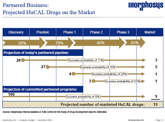 Gelder aus diesen Lizenz- und Meilensteinzahlungen stecke MorphoSys in eigene Entwicklungen. Fünf Programme gebe es hier. "MOR 103" gegen die rheumatoide Arthritis sei am weitesten. Derzeit starte gerade die Phase Ib/IIa. Die Zulassung habe MorphoSys erst vorletzte Woche bekommen. Damit werde der Antikörper erstmals am Menschen getestet! Die ganze Biotech- und natürlich auch die Finanzbranche schaue jetzt gespannt auf die kommenden Ergebnisse - auch wenn eine Auslizenzierung am Ende der Phase II voraussichtlich erst in 2012 erfolge.