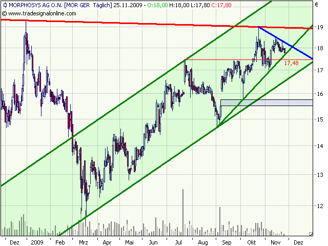 MorphoSys profitiert von der Not der großen Pharma-Unternehmen. Diese benötigen dringend gute neue Präparate, aber die Forschung ist zum einen sehr teuer und schwierig und die Zulassungshürden sehr hoch. Erst Ende Oktober hat Morphosys nach Super-Q3-Zahlen die Gewinnprognosen für das Gesamtjahr nach oben revidiert. Operativ sollen nun 15 bis 16 Mio. EUR in der Kasse unterm Strich klingeln, vorher ging man von 9 bis 11 Mio. EUR aus. Nach wie vor sitzt man auf einem Cash-Bestand von ca. 135 Mio. EUR – mehr als ein Drittel der aktuellen Marktkapitalisierung. Eine Partnerschaft mit Novartis spült dem Unternehmen auf Sicht mehrerer Jahre etliche 100 Mio. USD in die Kassen, im Idealfall könnte es eine Gesamtsumme von über einer Mrd. USD werden.
