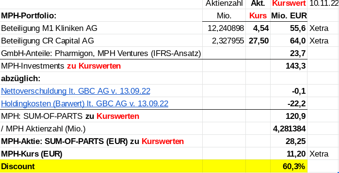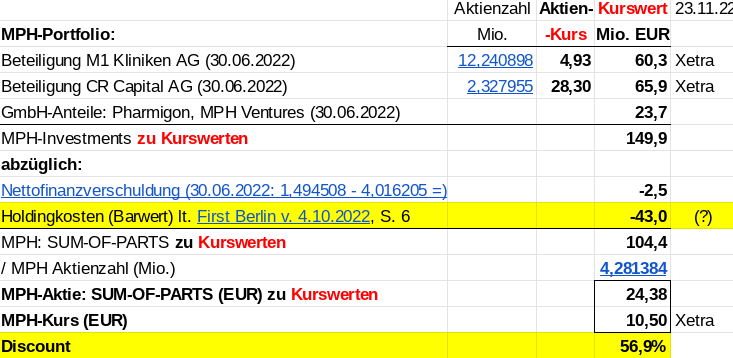 Ellis Acklin, Senior Financial & Business Analyst bei der First Berlin Equity Research GmbH, setzt in seiner "Sum‐of‐the‐Parts-(SotP)"-analyse der MPH Health Care AG vom 4.10.2022 auf Seite 6 (Table 6: MPH SotP model), https://www.mph-ag.de/files/uploads/ratings/...in_Research_Okt_22.pdf, die diskontierten Holdingkosten der MPH Health Care AG ("Present value of holding costs") mit zu hohen 43mio EUR an !