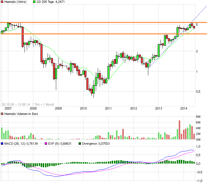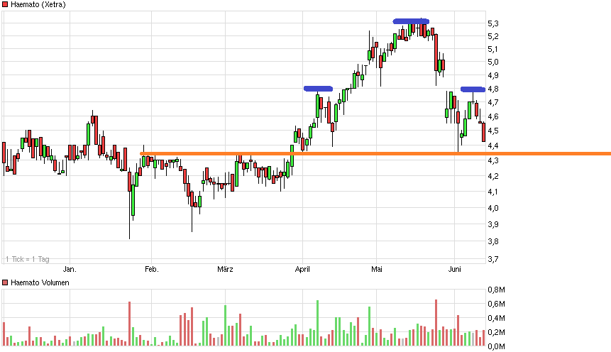 (www.4investors.de) - Die Haemato-Aktie hat nach einer Abwärtsbewegung von 5,34 Euro auf Dienstag erreichte 4,35 Euro wieder Fuß gefasst. Teile der Verluste sind rein optisch und gehen auf die Dividendenzahlung in Höhe von 0,30 Euro je Haemato-Aktie zurück, der überwiegende Teil ist damit aber ein „echter“ Kursverlust. Nun allerdings hat der Entry-Standard-notierte Titel die Chance auf eine Trendwende, nachdem die genannte Abwärtsbewegung an einer wichtigen Unterstützungszone um 4,34 Euro vorerst gestoppt werden konnte.