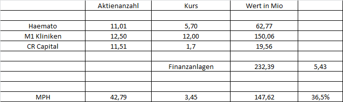 Die Marktkapitalisierung der MPH Health Care AG beträgt 148,7 Mio €. Dies entspricht fast genau der Beteiligung der M1-Kliniken AG mit einer Marktbewertung von 148,68 Mio €. Man bekommt also die restlichen Beteilungen an Haemato und CR Capital alsofor free! Klar ist auch, dass es bei Beteiligungsgesellschaften einen Abschlag von etwa 20 % gibt. Dennoch ist dieser Preisabschlag hier bei MPH in keiner Weise gerechtfertigt.