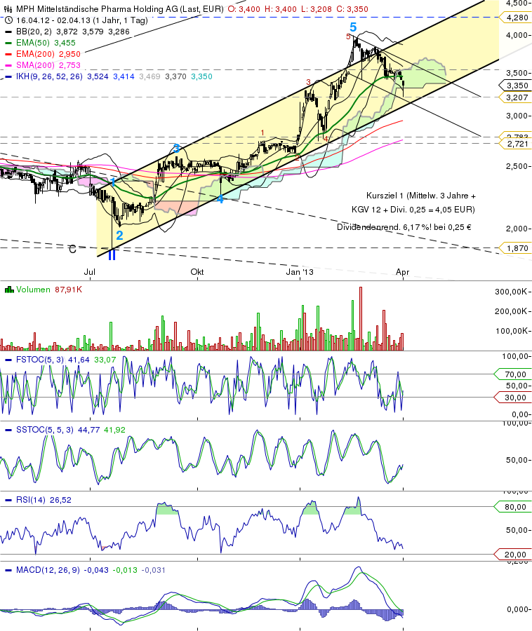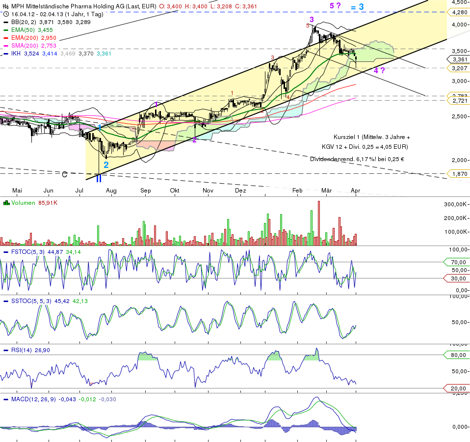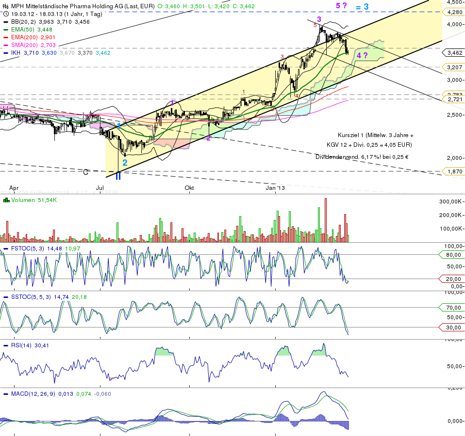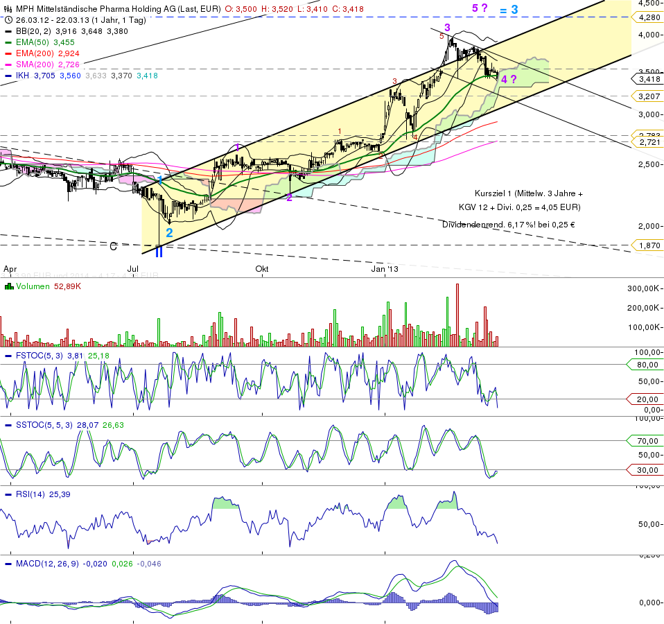 Es gibt keinen Grund am übergeordneten Aufwärtstrend zu zweifeln. Ich halte daher vorl. sowohl an meiner Elliot-Wellen-Zählung als auch an meinen lfr. Positionen fest. MPH sollte noch ein paar Jahre wachsen können und das anivsierte Ergebnis für 2014 von 0,34 EUR erscheint konservativ (ich rechne mit 0,35 - 0,37 EUR). Das ganze multipliziert mit einem 12er KGV ergibt ein konvervatives Kursziel für einen Wachstumswert mit gigantischer Ausschüttungsquote. Das es trotzdem zwischendurch immer mal wieder einen Schüttler nach unten geben kann, darf bei solch kleinen Nebenwerten niemanden wundern noch sollte es einen verunsichern.