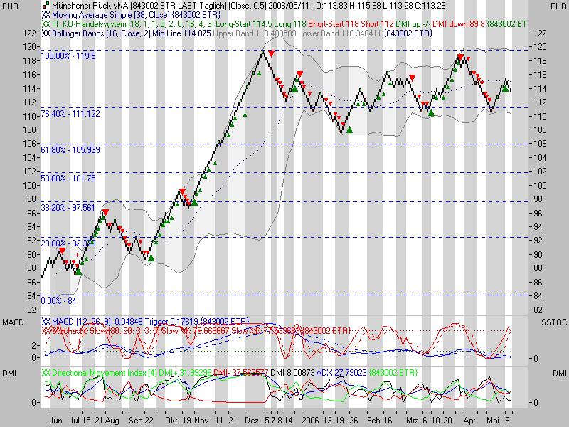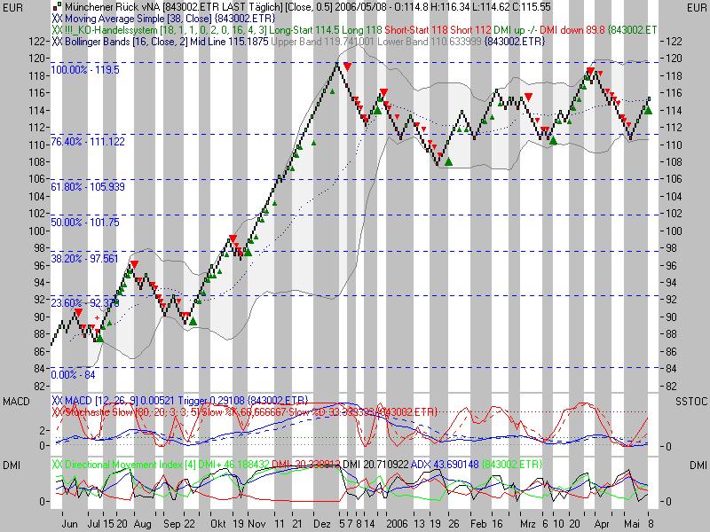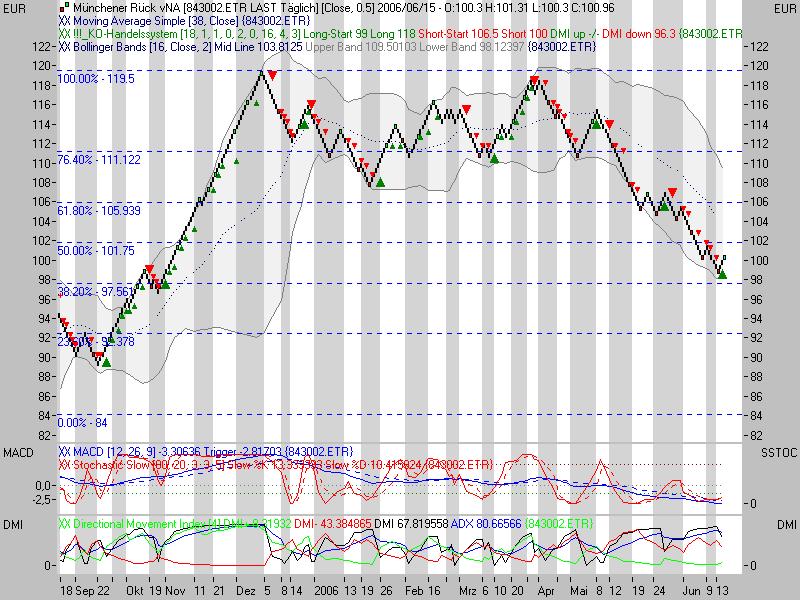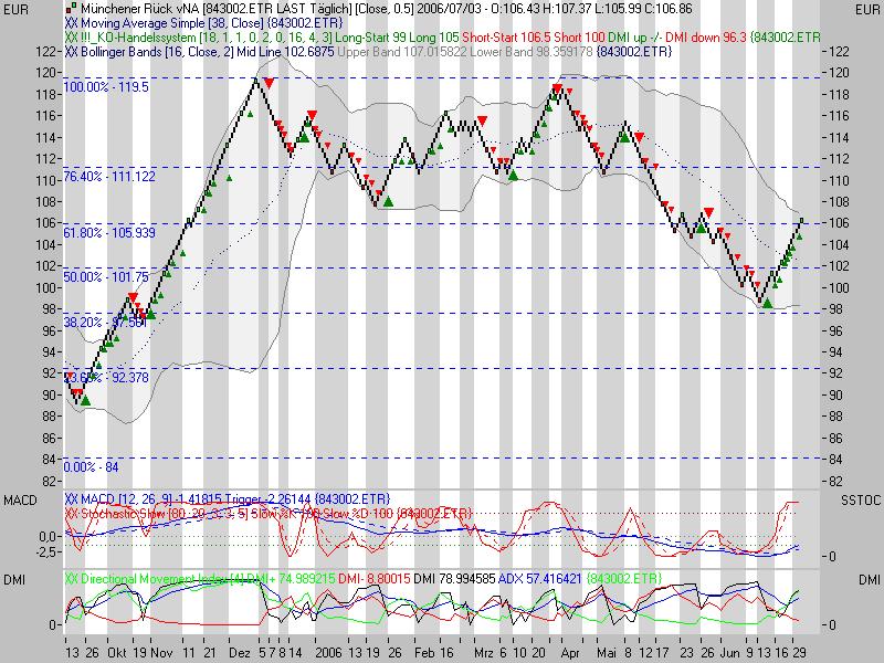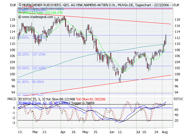 Rückblick: Die Aktie der MÜNCHENER RÜCK markierte im November 2000 das Allzeithoch bei 397,73 Euro. Von dort aus kam es zu einem rasanten Abverkauf, der die Aktie bis Ende März 2003 auf ein Tief bei 50,37 Euro führte. Bis November 2003 erholte sich die Aktie zunächst zügig auf 108,00 Euro. Es folgte eine lange, leicht abwärts gerichtete Korrekturphase, welche schließlich im November 2005 nach oben hin aufgelöst wurde und zu einem Ausbruch über 108,00 Euro führte. Der Anstieg endete an der exp. GDL 200 (EMA200) bei 121,88 Euro, woraufhin ein Rücksetzer bis 108,00 Euro führte Dort prallte die Aktie im Januar 2006 wieder nach oben und lief bis an den primären Abwärtstrend seit Januar 2001 bei 119,00 Euro. Dort scheiterte die Aktie im April und im Mai und rutschte anschließend unter 108,00 Euro zurück. In der linearen Skalierung der Preisachse des Charts stabilisierte sich die Aktie dann im Juni an der Kreuzunterstützung aus Horizontalunterstützung und Aufwärtstrend seit Oktober 2004 bei 99,55 Euro. Gerade dieser Aufwärtstrend wurde im logarithmischen Chart nicht mehr deutlich wahrgenommen, im linearen aber im bisherigen Julitief nochmals bestätigt, weshalb zur Ergänzung ein linearer Tageschart beigefügt ist. Im Juni und Juli scheiterte eine Rückkehr über die 108,00 Euro Marke, welche nach jüngstem Kursverlauf auf 107,40 Euro angepasst wurde. Aktuell nähert sich die Aktie wieder dem massiven Widerstandsbereich bei 105,51 - 107,40 Euro, wo auch wichtige GDL verla! ufen (s. Charts). Das kurz- und mittelfristige Chartbild ist aktuell n eutral zu werten, so lange die Aktie unterhalb der o.g. Widerstandszone und oberhalb von 99,55 Euro notiert.