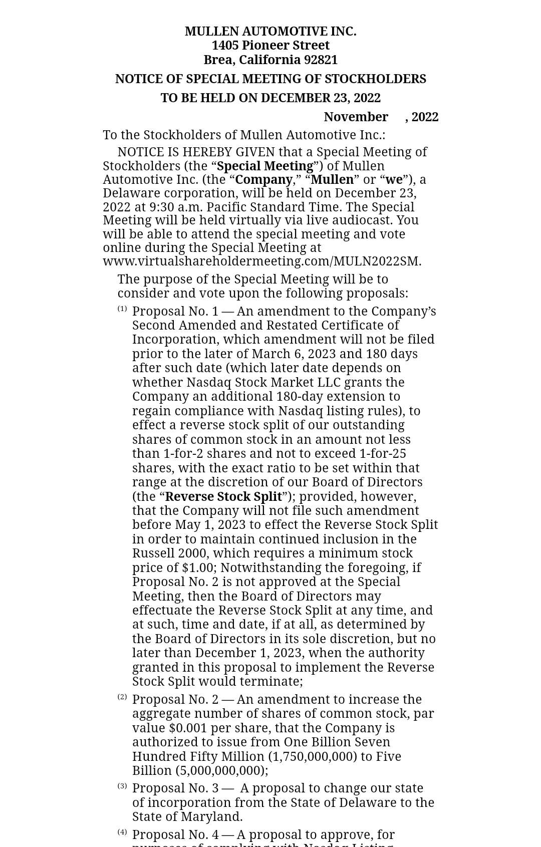 BREA, Kalifornien, 17. November 2022 (GLOBE NEWSWIRE) -- via InvestorWire -- Mullen Automotive, Inc. (NASDAQ: MULN ) ("Mullen" oder das "Unternehmen"), ein aufstrebender Hersteller von Elektrofahrzeugen ("EV"), gibt heute den Eingang von 150 Millionen US-Dollar am 16. November 2022 bekannt, die zum Teil für den Abschluss der ELMS-Aktiva verwendet werden.