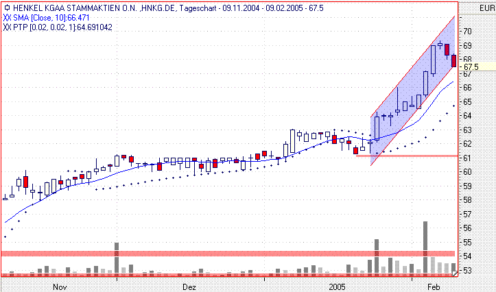 Bei Bruch des Trendkanals 67,40-50 könnte sich eine short Gelegenheit ergeben. Allerdings ist der Kurs gerade erst in die Bollinger Bands zurückgekehrt. Indikatoren deuten zart auf die Möglichkeit einer Kursabschwächung.