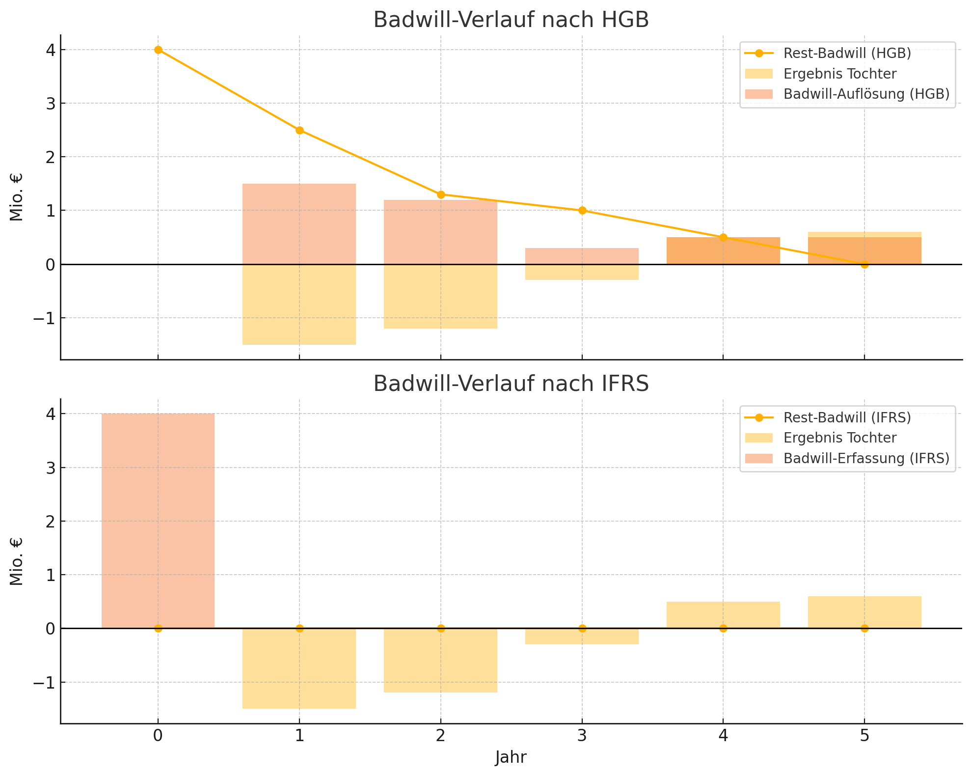 Bsp: gekauftes Unternehmen: Eigenkapital lt. Bilanz zum Kaufzeitpunkt 10 Mio. €, Kaufpreis 6 Mio. € -> Badwill 4€ Mio. Jahresergebnis des Unternehmens: Jahr 1: 1,5 Mio.€ Verlust, Jahr 2: 1,2 Mio. € Verlust, Jahr 3: 0,3 Mio. € Verlust , Jahr 4: 0,5 Mio. Gewinn , Jahr 5: 0,6 Mio. Gewinn. Bilanzierung im Konzernabschluss: Nach IFRS werden Vermögenswerte und Schulden der Töchter zum beizulegenden Zeitwert angesetzt (Fair Value). IFRS verbucht i.d.R. sofort erfolgswirksam in der Konzern-GuV + 4 Mio. Badwill. Der Badwill puffert die erwarteten Verluste (-1,5, -1,2 -0,3) (Chart 2). Übrig bleibt ein echter Lucky Buy von 1 Mio. € also der echte Kaufpreisvorteil den Mutares erzielen konnte. Dies summiert sich dann im Konzern auf 1 + 0,5 + 0,6 = 2,1 Mio. Gewinn. Es ist reines Accounting was hier läuft und ich kann im Besten Falle nicht erkennen, dass Mutares hier versucht sich das für ihre eigene Zwecke irgendwie zu Nutze zu machen. Zahlen würde ich demnach als soweit gut einstufen. Es steht und fällt im Grunde alles mit den Exits im Zeitverlauf.