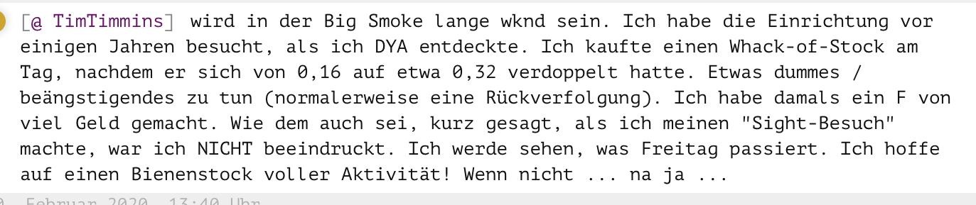 andere Firmen veröffentlichen Großaufträge. Dynacert hat die ersten Stück und alle Absichtserklärungen veröffentlicht. jetzt wo es eigentlich losgehen sollte bringen sie gar nichts. Meine Worte hier haben nichts mit Ungeduld zu tun. Ich finde das Verhalten von Dynacert gegenüber dem Kleinaktionär nicht ok. Von dem her kann ich Gonzos Entscheidung schon ein wenig nachvollziehen.