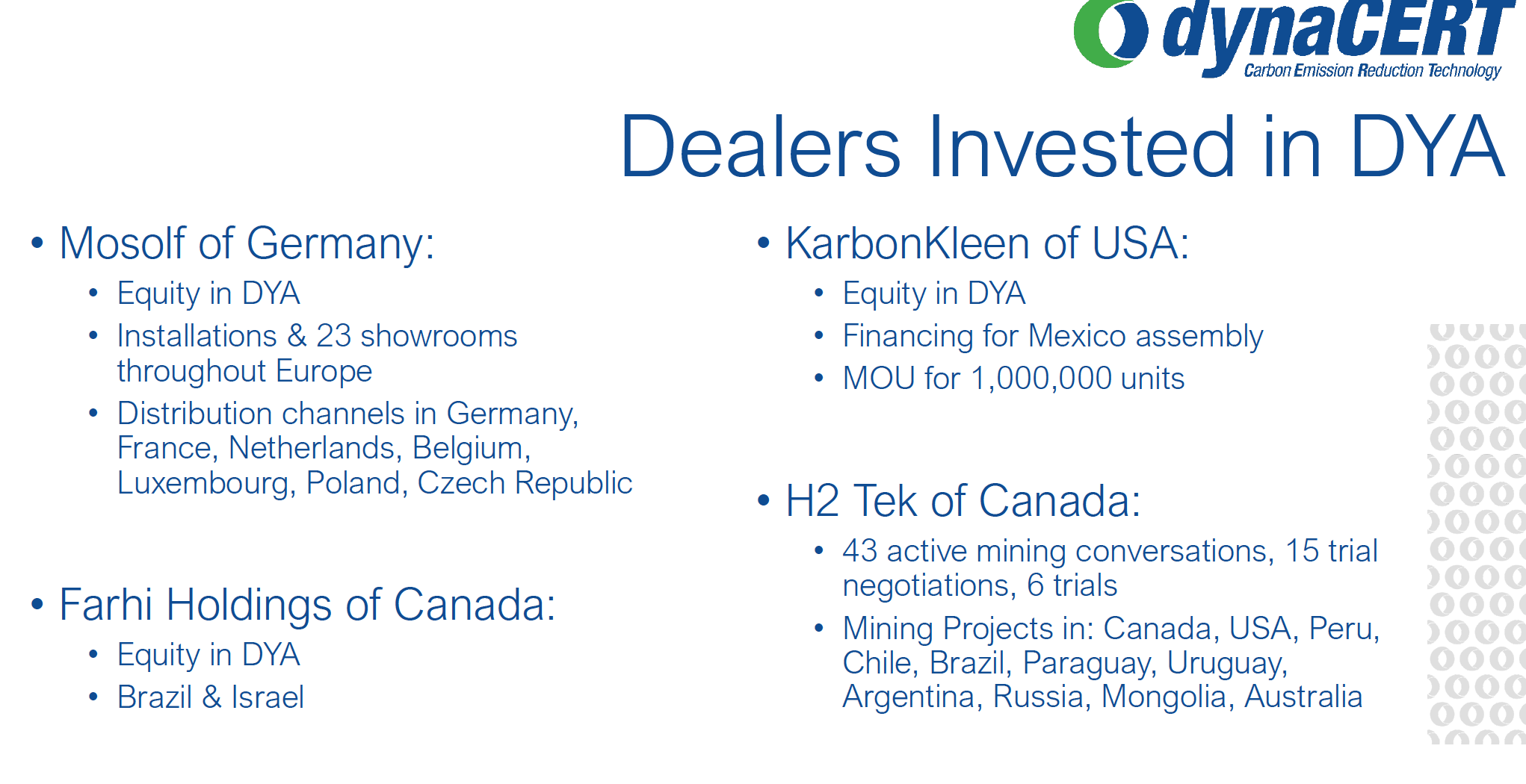 Alleine wenn man die aktuelle Investorenpräsentation mit den wichtigsten Partnern ansieht, kommen erhebliche Zweifel auf. Hier werden vier Händler genannt, die ihrerseits bei Dynacert investiert sein sollen: