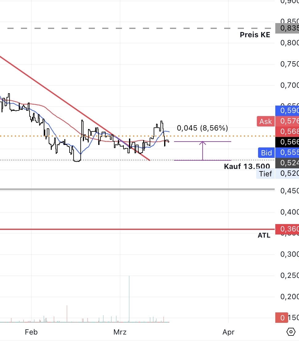 Wir stehen nicht kurz vor, sondern kurz nach dem Tiefpunkt der Aktie. Ich hab super eingekauft, allerdings nicht zu 0,45 Cent (das wäre arg billig), sondern zu 0,524 CAD, das war aber tatsächlich recht günstig. Klar bin ich nur mit kleinen Beträgen im Plus, da wohl niemand bei einem solchen start-up all in geht. Ich habe aber in der Vergangenheit mit Nano One immer gute Erfahrungen gemacht, weil ich entdeckt habe, dass die Aktie sich stets folgsam an die von mir eingezeichneten Chartmuster hält. Im übrigen bin ich bescheiden. Was ich als "gut im Plus" empfinde, mag für andere lächerlich sein.