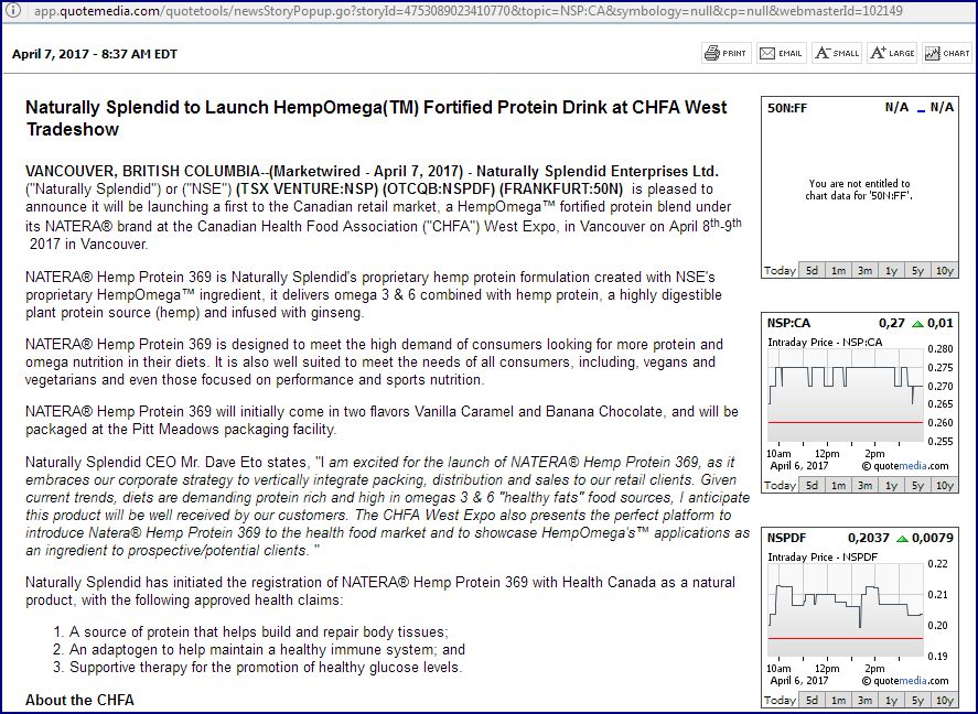 VANCOUVER, BRITISH COLUMBIA - (Marketwired - 6. April 2017) - Natürlich Splendid Enterprises Ltd. ("Naturally Splendid") (FRANKFURT: 50N) (TSX VENTURE: NSP) (OTC: NSPDF) freut sich bekannt zu geben, dass es unterschrieben hat Eine endgültige Vereinbarung mit der Canature Processing Ltd. ("Canature"), einem Branchenführer im Gefriergetrockneten Tierfutter- und Behandlungsmarkt für die Einbeziehung von Naturally Splendids proprietärem HempOmega in eine Reihe von Produkten.
