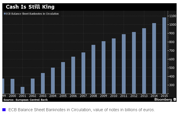 Europe’s ATMs worked overtime in 2015. A record 1.08 trillion euros ($1.17 trillion) of banknotes were in circulation, almost double the value 10 years ago, according to data compiled by the European Central Bank. That’s a counterargument to some bankers who say that electronic forms of cash will replace paper money sooner rather than later.