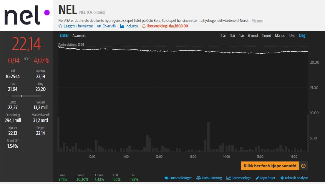 Bank of America (BofA) har tatt opp dekning av Nel med kjøpsanbefaling, viser en fersk analyse. Kursmålet settes på 30 kroner. Det betyr at meglerhuset ser en oppside på drøyt 30 prosent fra torsdagens kurs. Nel er opp 3,61 prosent til 22,94 kroner. Aksjen er opp hele 166 prosent omtrent siden nyttår.