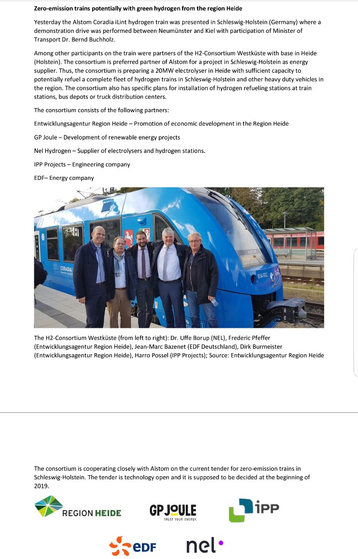 Oslo, 2. Oktober 2018) Nel ASA (OSE: NEL) gab heute die Teilnahme am H2-Consortium Westküste in Deutschland bekannt, das als bevorzugter Partner von Alstom für den potenziellen Einsatz eines 20 MW Elektrolyseurs und zugehöriger Betankungsanlage mit ausreichender Kapazität ausgewählt wurde Tanken Sie eine komplette Flotte von Wasserstoffzügen. "Wir freuen uns, bekannt zu geben, dass das H2-Konsortium Westküste als bevorzugter Partner von Alstom für die Entwicklung von Null-Emissions-Zügen für grünen Wasserstoff in Schleswig-Holstein ausgewählt wurde. Der gestrige Testversuch des Wasserstoffzuges Alstom Coradia iLint zwischen Neumünster und Kiel zeigt das Potenzial für umweltfreundlichen Wasserstoff im Schwertransport und das Engagement Deutschlands, an der Spitze der Entwicklung zu stehen ", sagt Jon André Løkke, CEO von Nel. Der Alstom Coradia iLint-Wasserstoffzug führte am 1. Oktober 2018 eine Demonstrationsfahrt zwischen Neumünster und Kiel unter Beteiligung von Verkehrsminister Dr. Bernd Buchholz durch. H2-Konsortium Westküste, das neben Nel aus Entwicklungsagentur Region Heide, GP Joule, IPP besteht Projects und EDF, ist der bevorzugte Partner von Alstom für die Entwicklung von Elektrolyse- und Tankanlagen im Megawattmaßstab, die in der Lage sein werden, eine komplette Flotte von Wasserstoffzügen in Schleswig-Holstein sowie andere schwere Nutzfahrzeuge in der Region zu betanken . Das Konsortium arbeitet derzeit eng mit Alstom bei einer Ausschreibung für Null-Emissions-Züge zusammen, die Anfang 2019 beschlossen wird und ab 2021 in Frage kommt. Gemeinsame Pressemitteilung des H2-Konsortiums Westküste finden Sie hier: