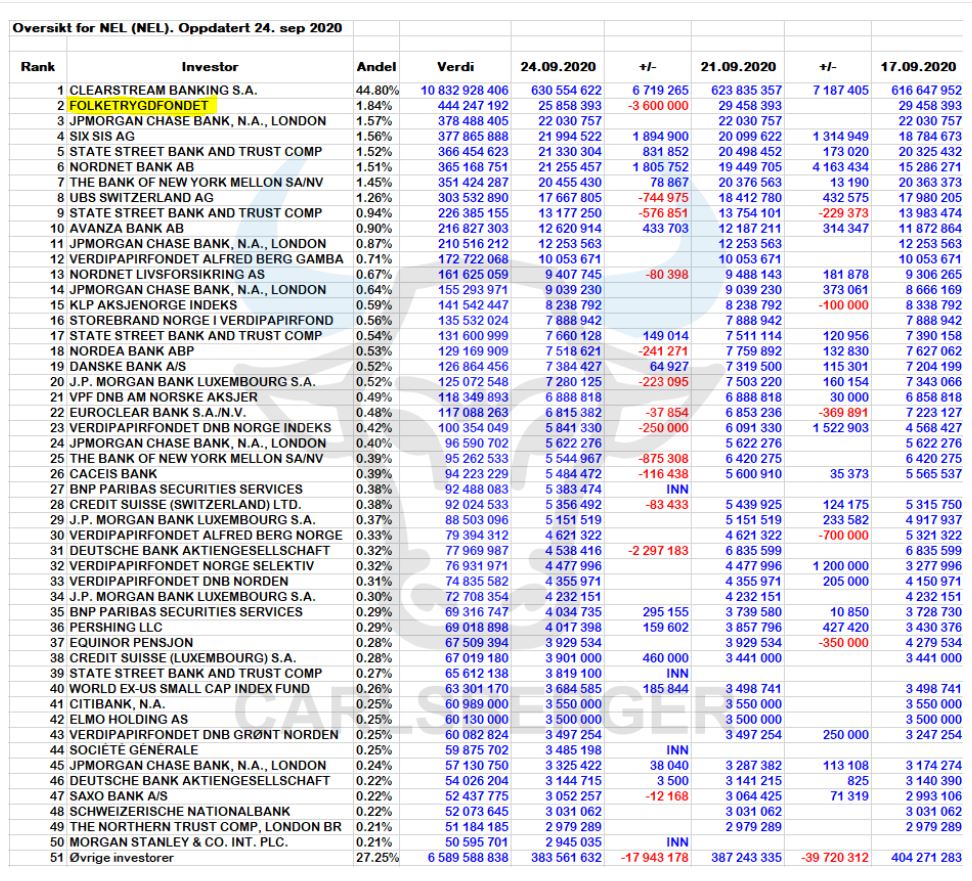 Der Preis pro Aktie im Rahmen der Privatplatzierung wurde auf 22,30 NOK festgelegt, was einen Wert der aktuell ausgegebenen und ausstehenden Aktien der Gesellschaft von rd. 700 Mio. NOK. Fünf wichtige Investoren haben sich unter bestimmten Bedingungen verpflichtet, Aktien für 250 Mio. NOK zu zeichnen und zuzuteilen: 120 Mio. NOK von DNB Asset Management AS, 50 Mio. NOK von Klaveness Marine Finance AS, 30 Mio. NOK von Sissener AS 25 Mio. NOK von Pareto Asset Management AS und 25 Mio. NOK von der Erste Asset Management GmbH.