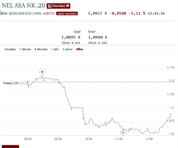 Ein kleiner Auftrag von Yara, welcher an die Konkurrenz geht ist leicht verdaulich, da die Welt noch Milliarden Euro von Aufträgen offen hält. Wenn die Rahmenbedingungen nicht gepasst haben, dann besser getrennte Wege gehen. Nel hat sich bestens positioniert, die passenden Aufträge werden schon zu genüge reinflattern. Aber Tage wie diese sind ja nicht objektiv genug um das zu erkennen. Derzeit weht ein pessimistischer Wind umher, das hat man von der Medienwirksamkeit der heutigen Zeit. Funktioniert besser als Werbung. Die Großen verunsichern die Kleinen um an ihre eigenen Ziele zu kommen und das zu fast jedem Thema. Denkt darüber nach und lass euch nicht verunsichern.