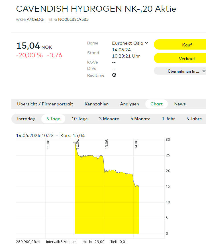 CAVENDISH HYDROGEN | NO0013219535 | Euronext exchange Live quotes