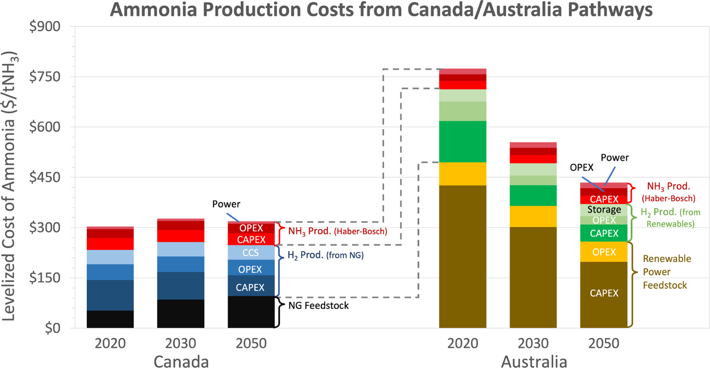 Ergebnis: Kanada ist laut Studie mit blauem Ammoniak bis zum Jahr 2050 wettbewerbsfähig gegen Australien. Erst dann wird Australien die gleichen Produktionskosten aufgrund höherer Sonnen- und Windflächen und niedrigeren Stromkosten erzielen. Im Jahr 2020 war grünes Ammoniak aus Australien für Japan doppelt so teuer wie blaues Ammoniak aus Kanada (850 USD/tNH3 gegen 422 USD/tNH3). Im Jahr 2050 haben sich die Preise weitestgehend angeglichen.