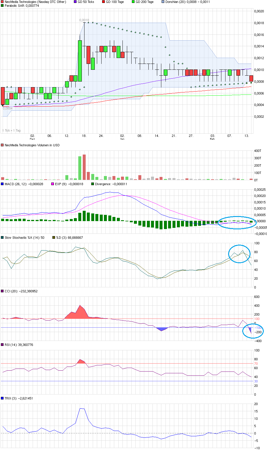 Vielleicht sehen wir noch mal kurz die 0,0007$, das wäre eine schöne Grundlage für einen Doppelboden. Der Parabolic SAR als Trendfolger gibt seit Ende Januar immerhin schon grün, doch so richtig entfalten kann er sich erst bei einem Ausbruch, so wie es z.B. Dezember 2013 passiert ist.