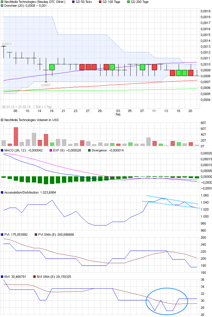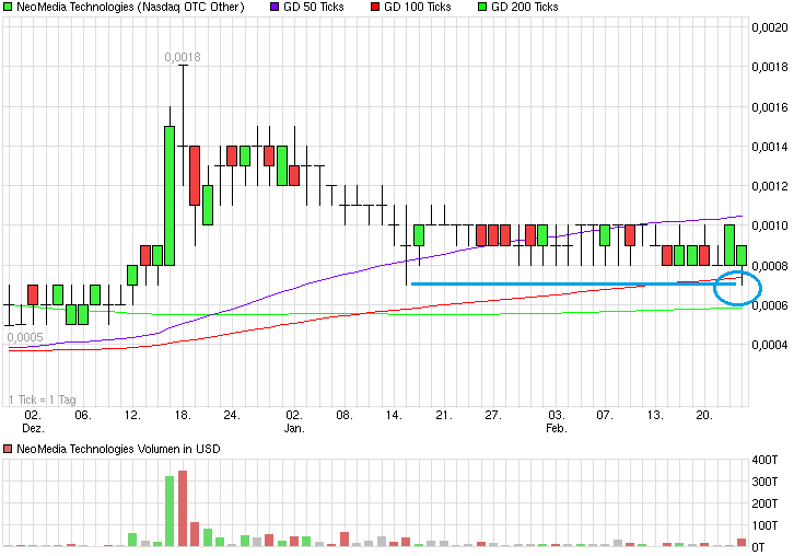 NEOM wäre nicht das was sie ist, wenn der Kurs nicht mal wieder eine Warteschleife einlegt. Nach dem Kaufsignal im MACD wurde die Triggerline nun unerfreulicherweise mehrfach geschnitten. Das ist zwar kein Zeichen von Stärke, aber es fällt mir auf, dass der Kurs nun zwischen der 50- und 100-Tage-Linie (beide steigend) eingekeilt ist. Die 100-Tage-Linie markiert dabei eine Unterstüzung, wogegen wir oben einen Widerstand haben.