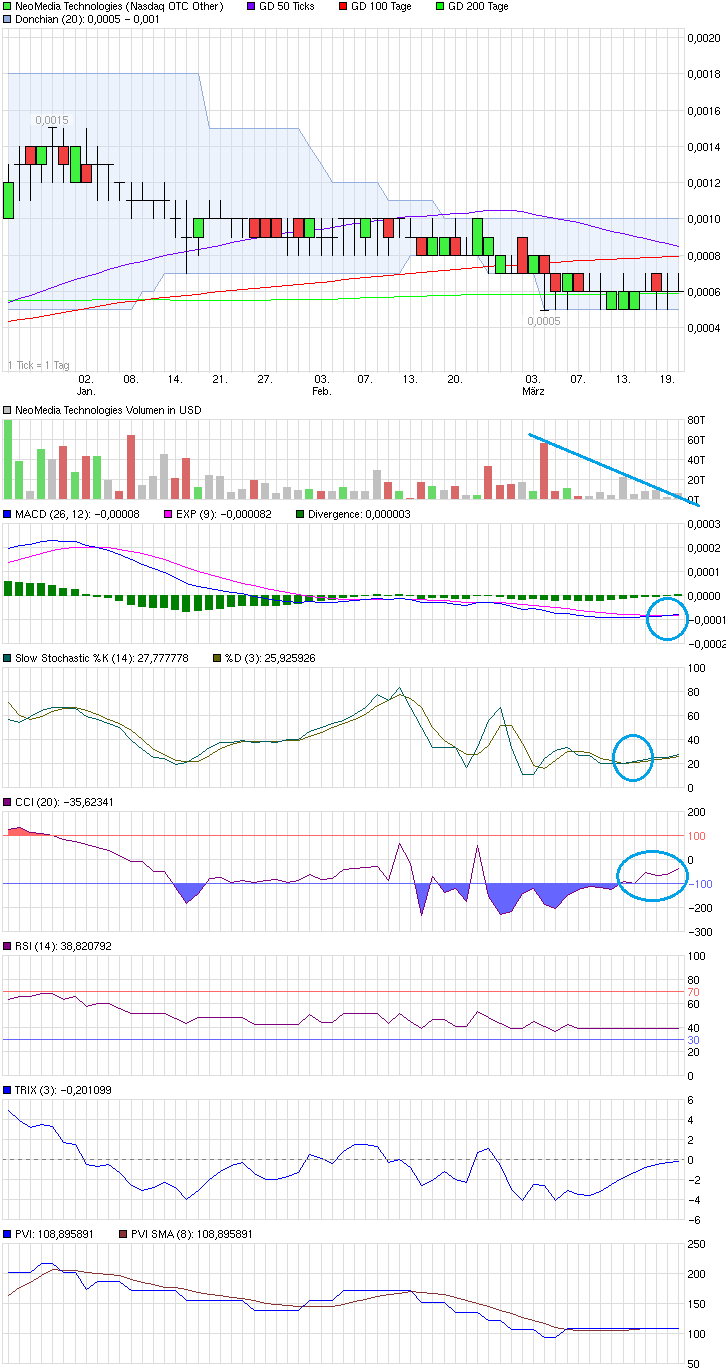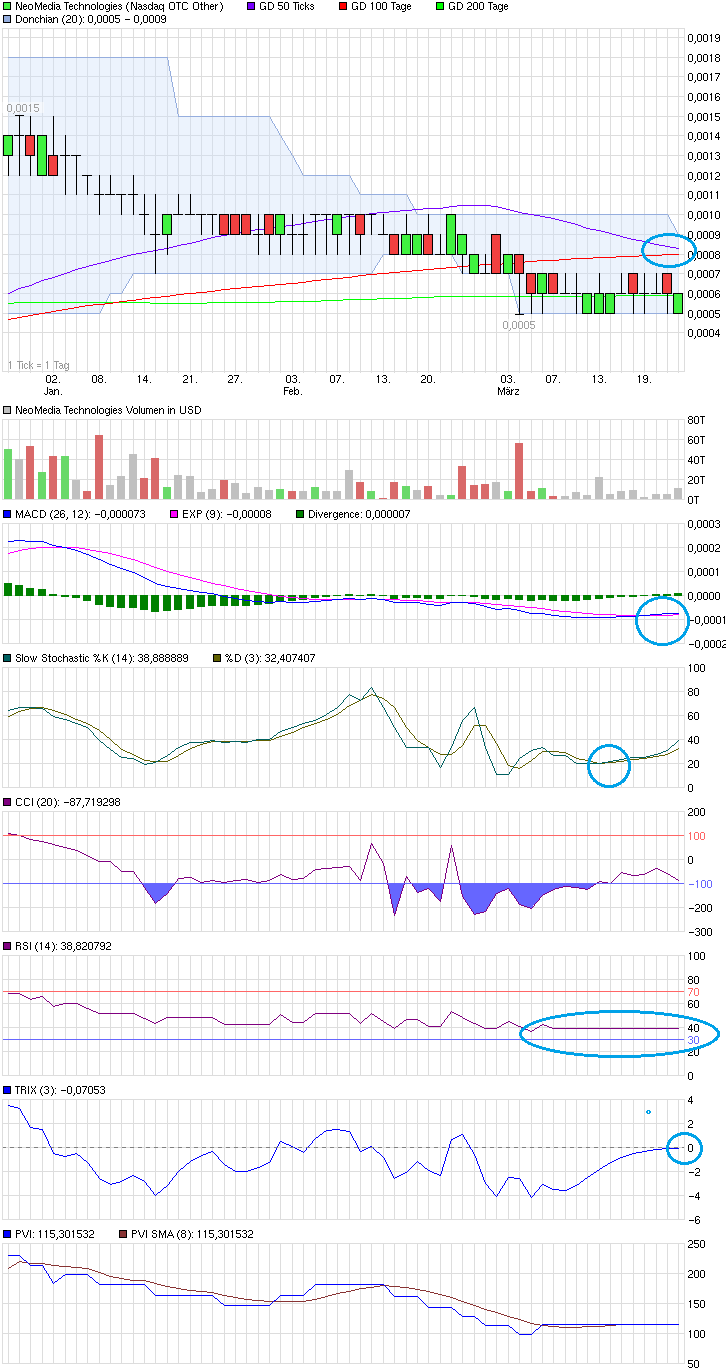 Am Chart kann man ja nun gut erkennen, das man Reversesplits und Verwässerung betrieben hatte und jetzt immer noch so viele Aktien am Markt hat, wow, ist ne ganz schöne Geldverbrennungsmaschine oder? Vielleicht gehts ja bei Neomedia endlich bald steil Aufwärts, ich drück euch die Daumen!;-)