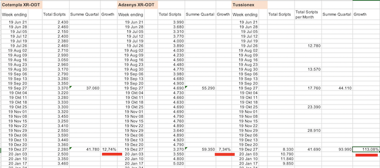 Die Scriptzahlen für Q3/20 sehe ich gegenüber Q3 /19 nicht verbessert. Meiner Meinung müsten die beiden Medikamente Zahlen von fast 100.000 Verschreibungen aufweisen, damit Neos Geld verdient.