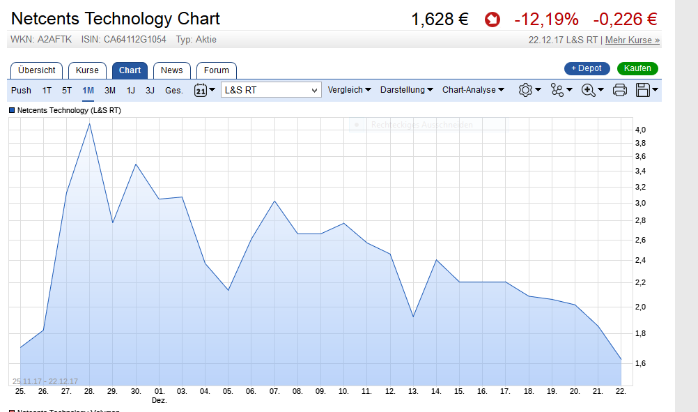 die Arbeit, die Netcents macht ist unabhängig vom Aktienkurs. Wenn alles so scheiße und ungewiss ist, warum äußerst du dich dann am laufenden Band dazu. Kryptos werden sich irgendwie durchsetzen, in welcher Form auch immer und ein Crash, wenn man ihn so nennen darf, ist gut und bereinigend und zeigt eigentlich nur, wie wichtig die Arbeit von Netcents und damit verbunden einer stabilen Kryptowährung ist. Das wir an Blockchain über kurz oder lang nicht vorbeikommen sollte in diesem Forum jedem klar sein. Wenn du kein Vertrauen hast, dann behalte es für dich. Jetzt auszusteigen kommt , für die meisten Schreiber hier, wohl nicht mehr infrage ! Ich gebe Ihnen Zeit und wenn sie erst in einem oder 2 Jahren wieder bei 3-4 stehen, soll es mir auch egal sein. So läuft Börse eben oft. 5 vor 12 ist es auf alle Fälle nicht und wenn doch, dann ist die Zeit für Leute wie dich zumindest schon abgelaufen.