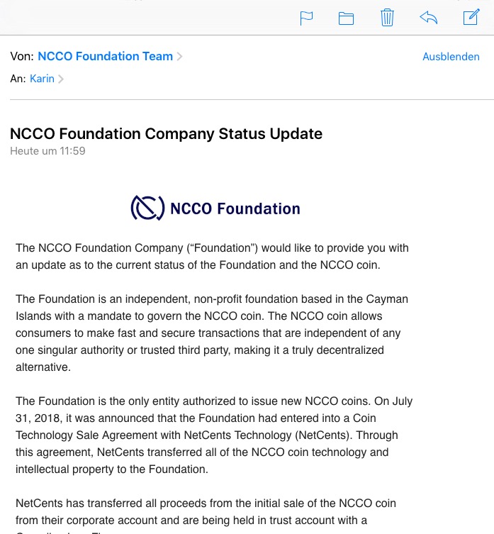 Die gesamte NCCO-Münztechnologie und das geistige Eigentum wurden seitens NC an die Stiftung übertragen. Heisst für mich auch abgerechnet. Und das erklärt mir den Haushalt der letzten Monate bei NC und warum bislang keine KE…