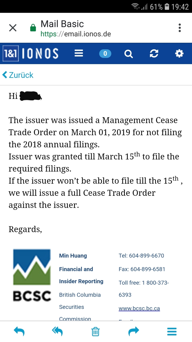 March 1st 2019 – Company announced the Financial Statements for period ending October 31, 2018 will be filed late. The Company has voluntarily applied to the applicable securities regulatory authorities and received a management cease trade order related to the Company’s securities to be imposed against all of the persons who are currently directors or officers of the Company to trade securities of the Company. The management cease trade order will be in effect until the Annual Financial Filings are filed. All other securityholders will still be able to trade in the securities of the Company in accordance with applicable securities laws.