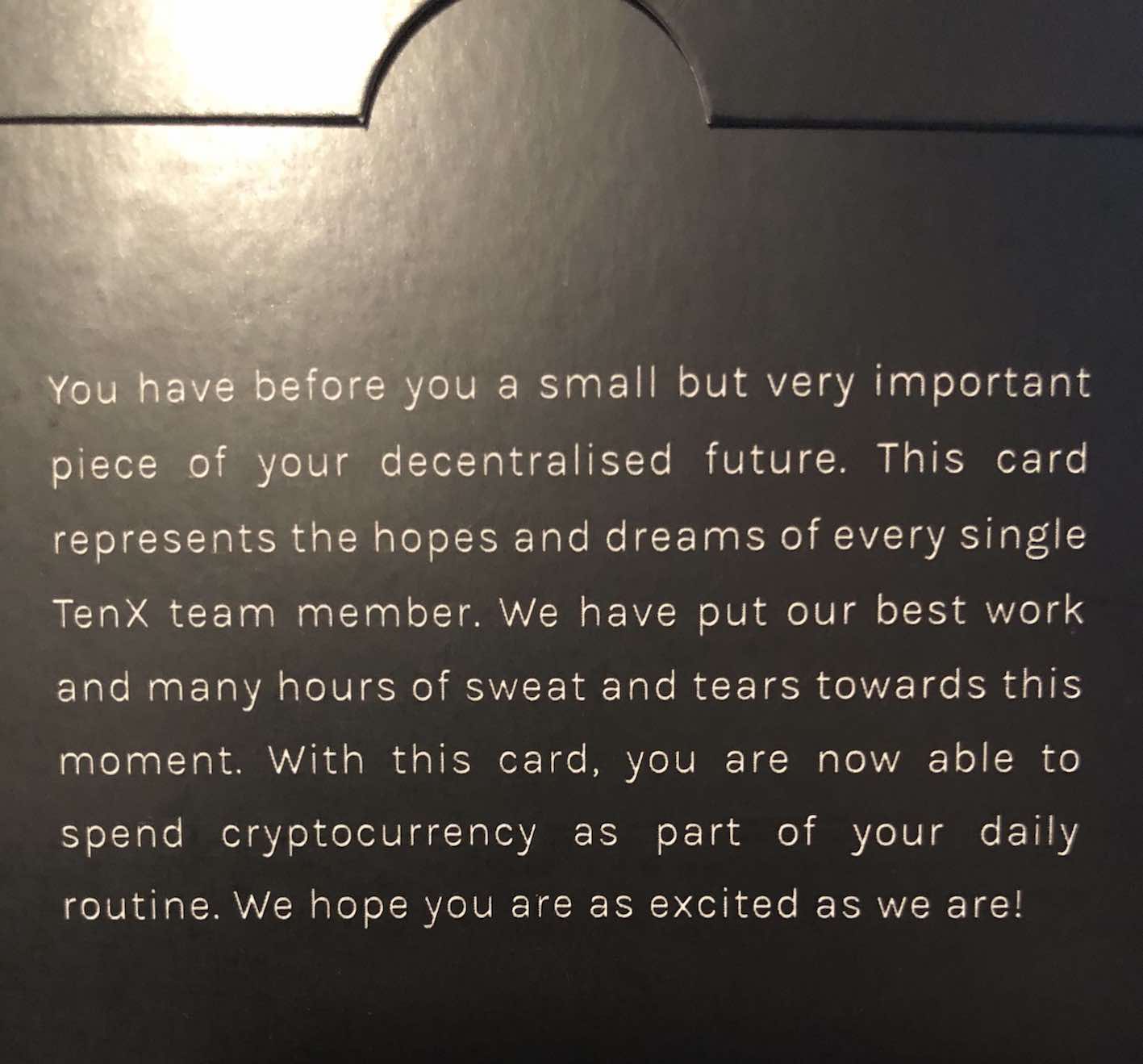 Mir persönlich zeigt es, dass man einen festen Glauben nicht wegen irgendwelcher Probleme, welche ein Start-up in diesem neuen Segment zwangsläufig und reihenweise hat, nicht aufgeben sollte. Schon gar nicht, wenn sich an den fundamentalen Daten und den Zielen eines Unternehmens nichts grundlegendes ändert, außer dass es sich entwickelt. TenX ist vom Token (PAY) her gesehen "klinisch tot" (könnten auch NC shares sein :) aber dieser Punkt wird sich ändern. Firmen wie TenX und NC verändern die Welt der Zahlungsmittel und Abwicklung. Die Box der Karte ist klasse gemacht und was mich neben der Karte am meisten beeindruckt hat ist der Schriftzug auf der Rückseite "The revolution begins with you"