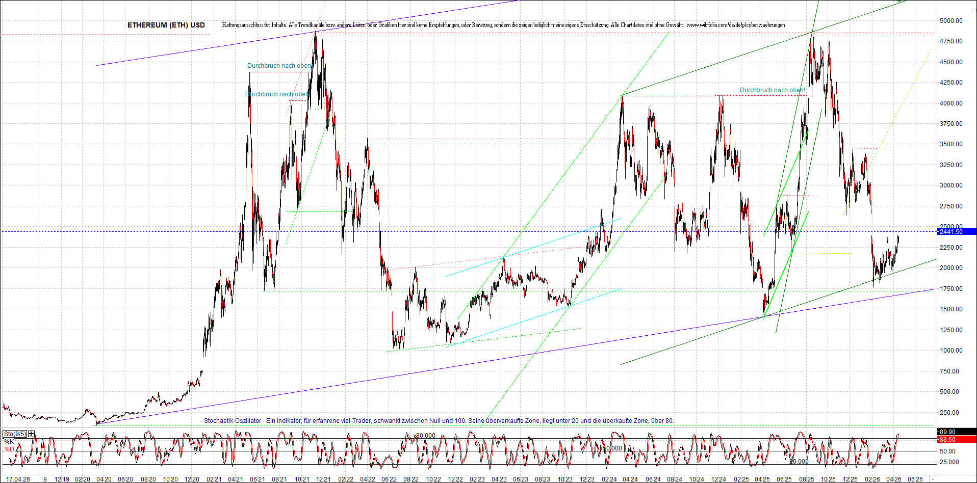 Mehr über die 7 wikifolio-Endlos-Zertifikate gibt es hier. Aber bitte da nicht erschrecken wegen den charts, weil die wikifolios sollten die original-performance so getreu nachbilden wie möglich, aber die charts bei wikifolio zeigen leider nur ein kleines Zeitfenster. Deswegen habe ich hier die entsprechenden langfristigen original-performance-charts reingestellt. Die kann ich auch gerne ab und zu aktualisieren. Die Trendkanäle bzw. andere Linien, oder Grafiken in diesem thread zeigen aber ausschließlich meine eigene Meinung und sind keine Empfehlungen, oder Beratung.