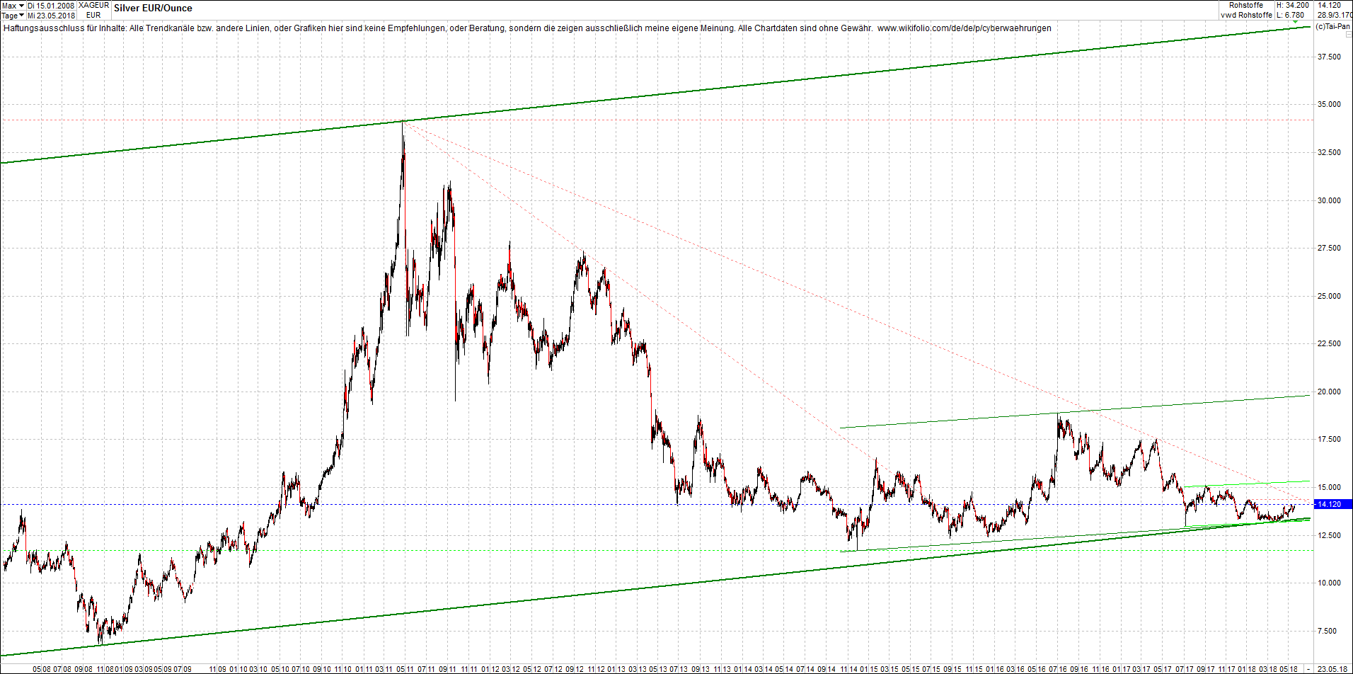 Mehr über die 7 wikifolio-Endlos-Zertifikate gibt es hier. Aber bitte da nicht erschrecken wegen den charts, weil die wikifolios sollten die original-performance so getreu nachbilden wie möglich, aber die charts bei wikifolio zeigen leider nur ein kleines Zeitfenster. Deswegen habe ich hier die entsprechenden langfristigen original-performance-charts reingestellt. Die kann ich auch gerne ab und zu aktualisieren. Die Trendkanäle bzw. andere Linien, oder Grafiken in diesem thread zeigen aber ausschließlich meine eigene Meinung und sind keine Empfehlungen, oder Beratung.