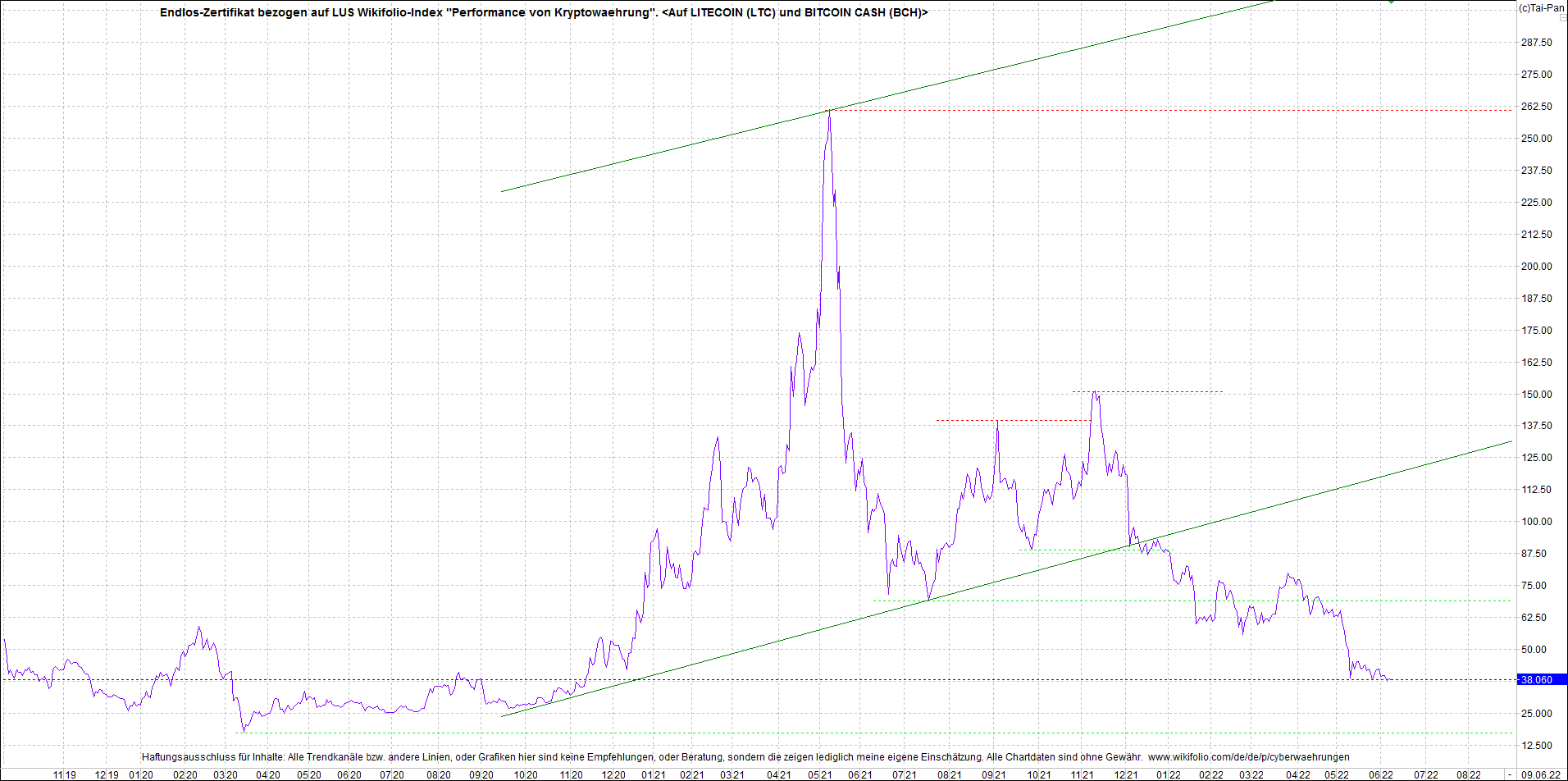 Anbei das Zertifikat, bekannt als: Endlos-Zertifikat bezogen auf LUS Wikifolio-Index "Performance von Kryptowaehrung",  jetzt versorgt mit Performance von Litecoin (LTC) und von Bitcoin Cash (BCH).