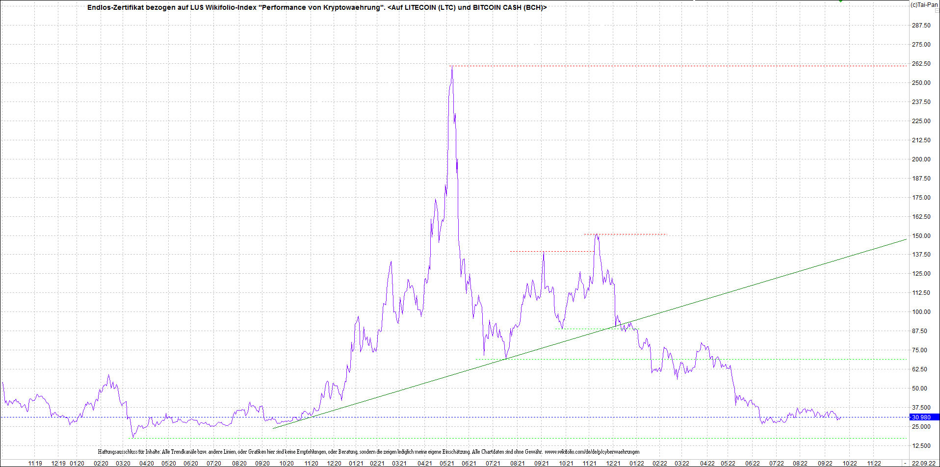 Anbei das Zertifikat, bekannt als: Endlos-Zertifikat bezogen auf LUS Wikifolio-Index "Performance von Kryptowaehrung",  jetzt versorgt mit Performance von Litecoin (LTC) und von Bitcoin Cash (BCH).