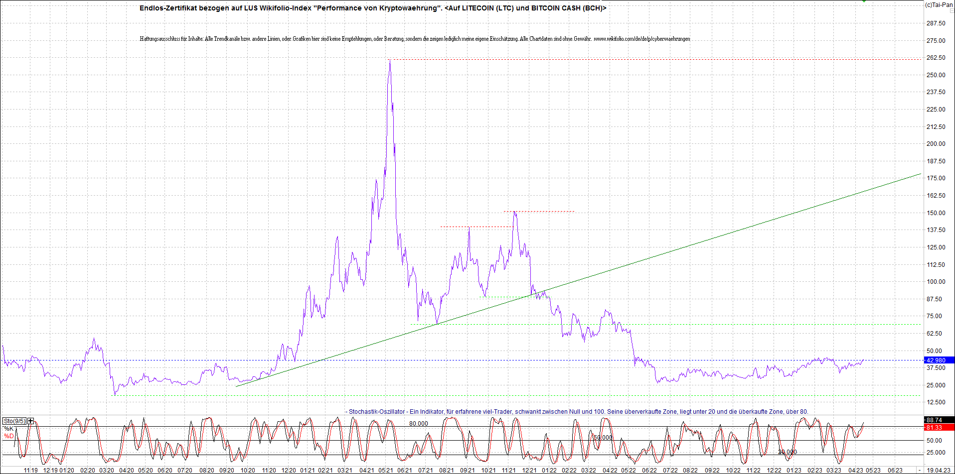 Anbei das Zertifikat, bekannt als: Endlos-Zertifikat bezogen auf LUS Wikifolio-Index "Performance von Kryptowaehrung",  jetzt versorgt mit Performance von Litecoin (LTC) und von Bitcoin Cash (BCH).