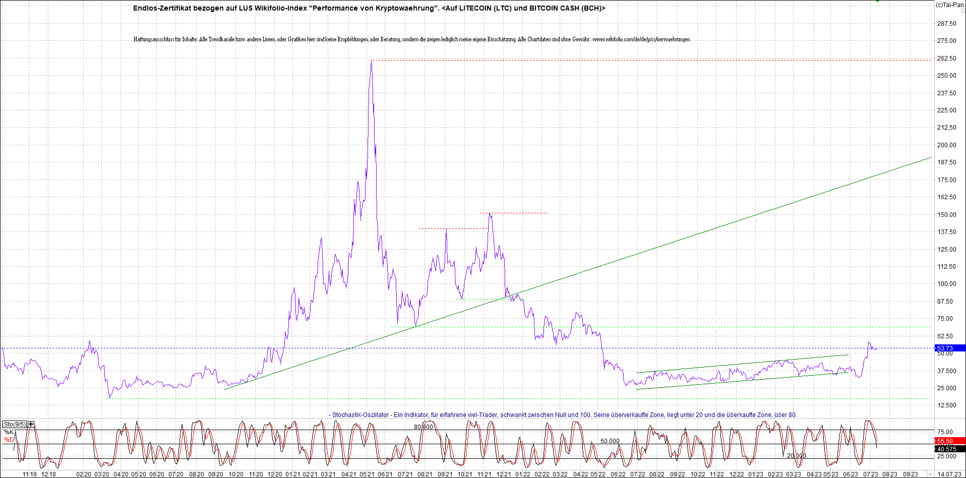 Oben das Zertifikat, bekannt als: Endlos-Zertifikat bezogen auf LUS Wikifolio-Index "Performance von Kryptowaehrung",  jetzt versorgt mit Performance von Litecoin (LTC) und von Bitcoin Cash (BCH).