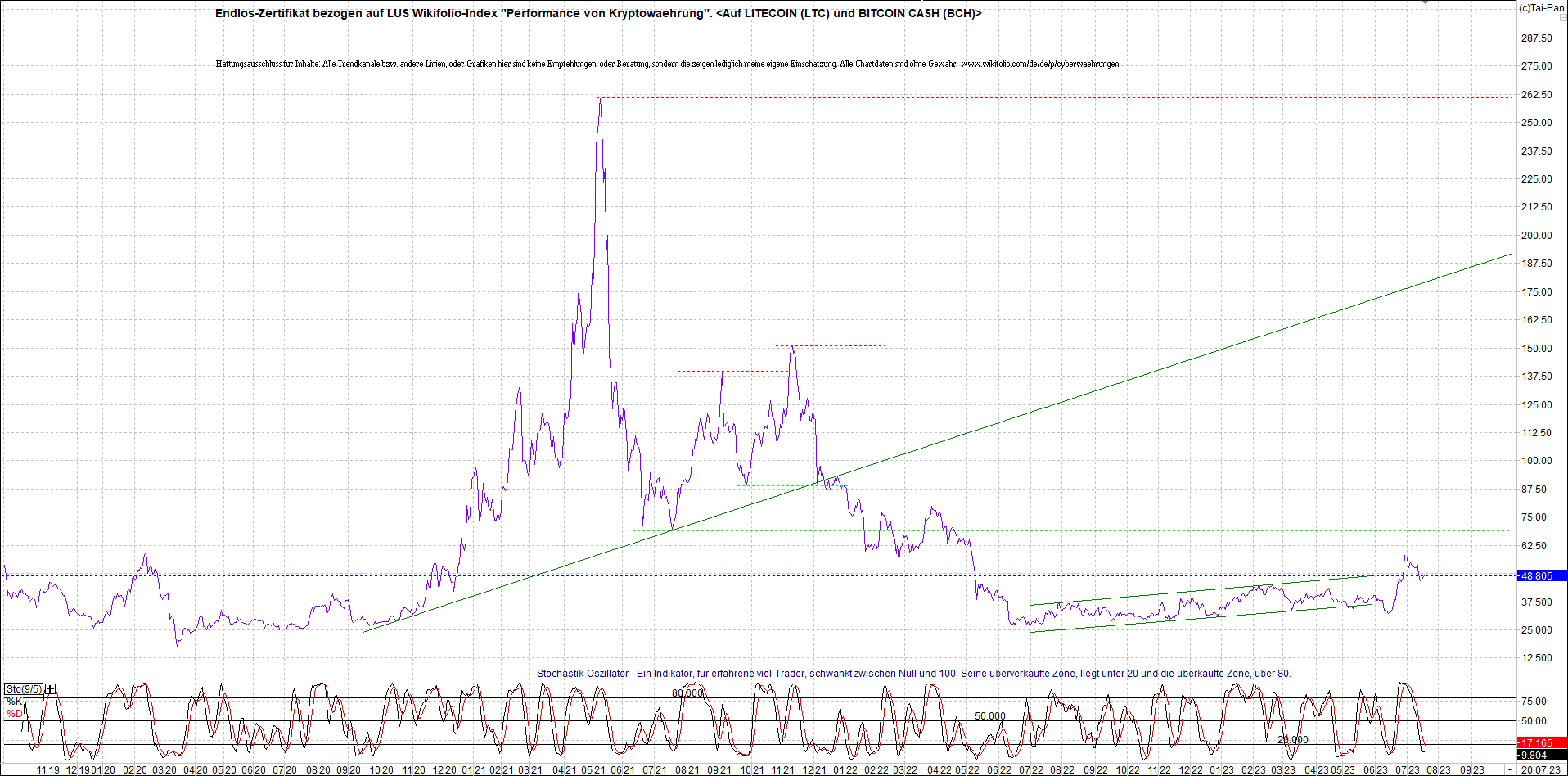 Anbei das Zertifikat, bekannt als: Endlos-Zertifikat bezogen auf LUS Wikifolio-Index "Performance von Kryptowaehrung", jetzt versorgt mit Performance von Litecoin (LTC) und von Bitcoin Cash (BCH).