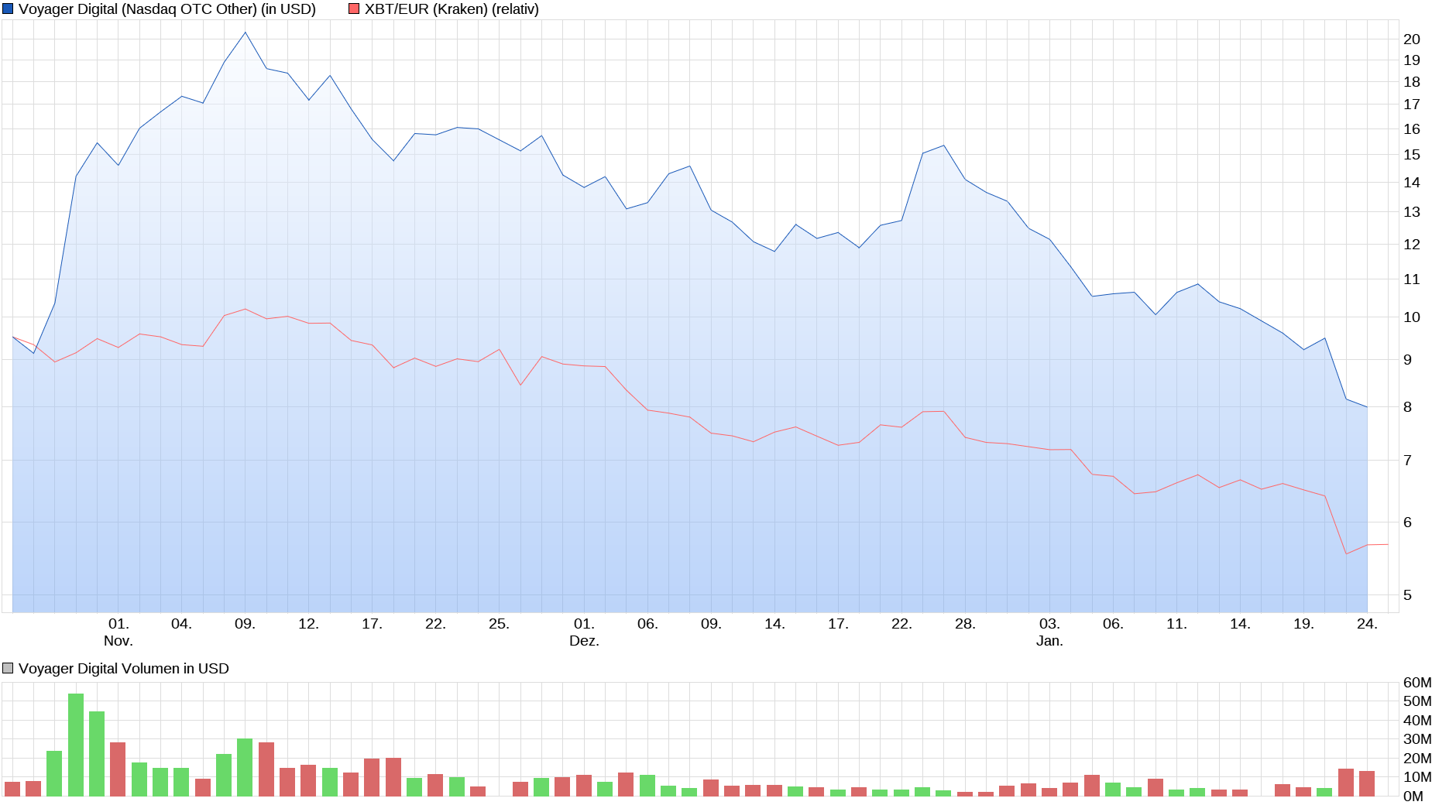Die starken Zahlen (Umsätze usw.) von VOY spielen da nur eine untergeordnete Rolle, leider. Wir werden hier noch viel Geduld benötigen bis sich dies ändert. Dieses Jahr werden alle welche in Kryptowährungen oder Firmen wie VOY investiert sind gute Nerven benötigen, denn falls die FED und EZB die Zinsen schneller erhöhen als geplant wird es erstmal deutlich nach unten gehen da viele Leute dann Ihr "Spielgeld" welches sie in Kryptos angelegt haben herausnehmen und auf Nummer sicher gehen. Irgendwann geht es dann natürlich auch wieder hoch, aber man muss die Verluste erstmal aussitzen können und wenn möglich günstig nachkaufen/wieder einsteigen, den richtigen Zeitpunkt dafür zu finden ist natürlich nicht einfach. Ich persönlich denke, dass es ein ziemlich turbulentes Jahr wird bei Aktien, aber ich lasse mich gerne eines besseren belehren. Wünsche allen auch dieses Jahr ein glückliches Händchen bei der Aktienauswahl und Investitionen. Bei VOY bin ich long, da kann ich auch mal ein schlechtes Jahr aussitzen.