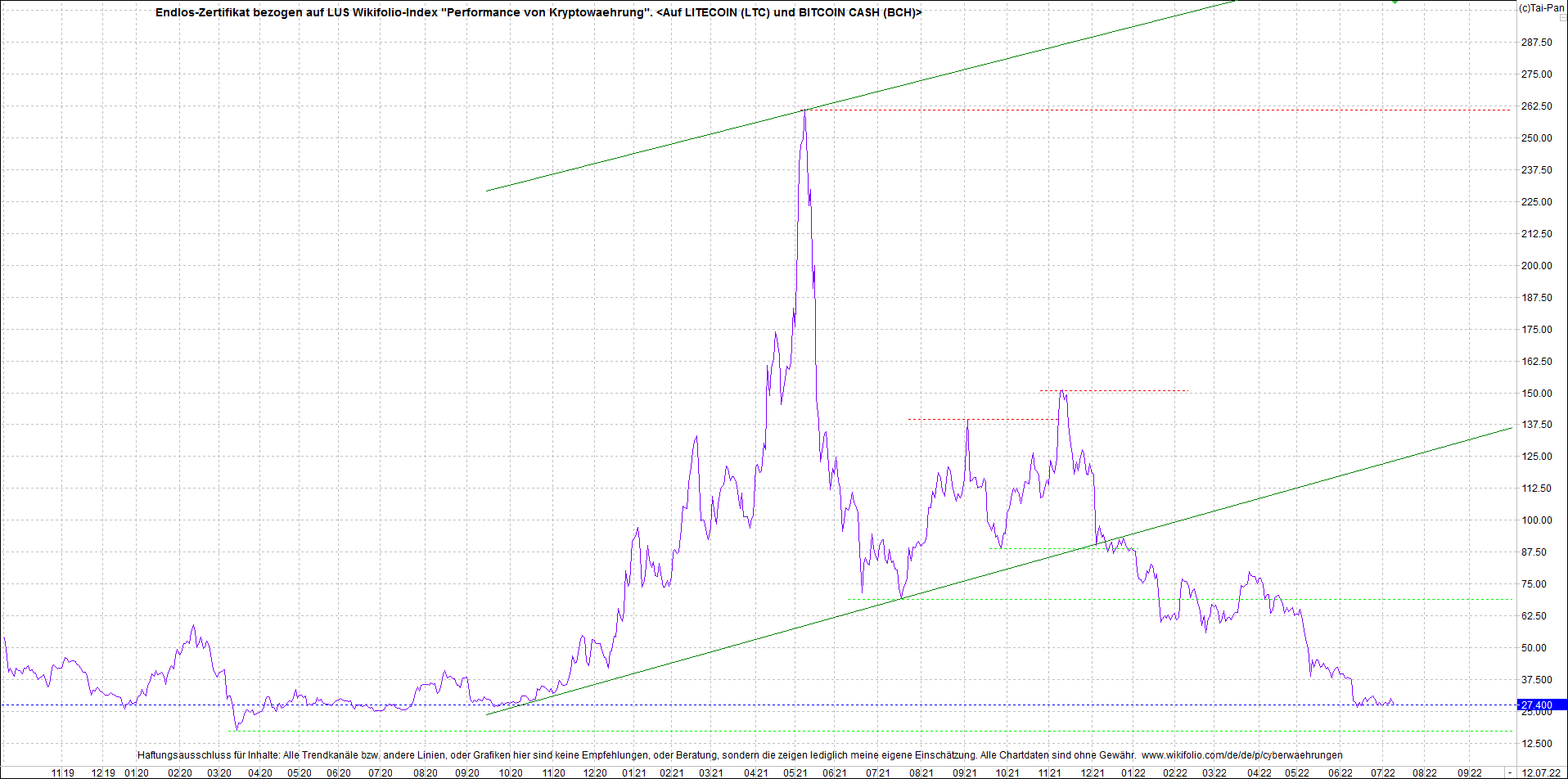 Anbei das Zertifikat, bekannt als: Endlos-Zertifikat bezogen auf LUS Wikifolio-Index "Performance von Kryptowaehrung",  jetzt versorgt mit Performance von Litecoin (LTC) und von Bitcoin Cash (BCH).