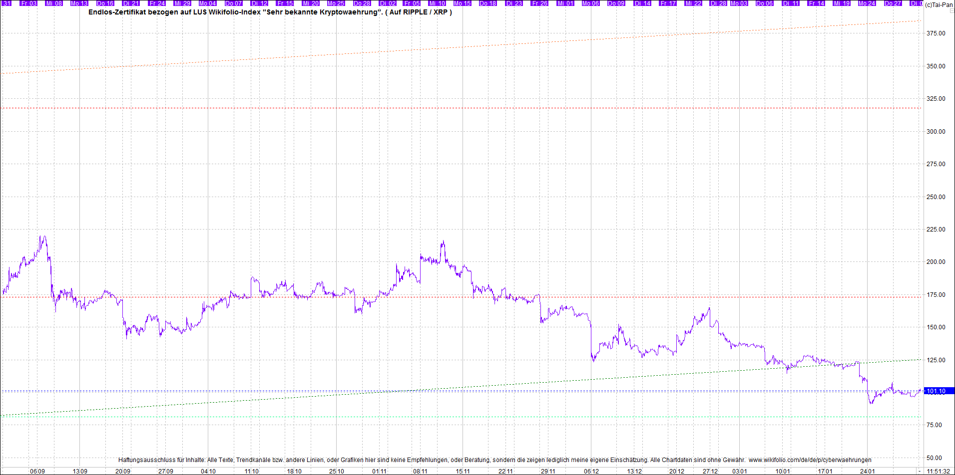 Das dazu passende Ripplezertifikat, ist bekannt als: Endlos-Zertifikat bezogen auf LUS Wikifolio-Index "Sehr bekannte Kryptowaehrung".