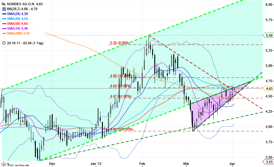 Positiv entwickelte sich dagegen der Auftragseingang, der um 32% auf EUR 1.107 Mio. stieg. Dabei legte Nordex gegen den Markttrend insbesondere in Europa zu, hier stieg das Neugeschäft um über 50% auf EUR 856 Mio. Der Auftragsbestand stieg damit zum Jahresende auf rund EUR 700 Mio. (Vorjahr: EUR 411 Mio.) und bildet damit eine gute Basis für das im laufenden Jahr geplante Umsatzwachstum. Dies wird auch durch den erwarteten weiterhin erfreulichen Vertriebserfolg im ersten Quartal des laufenden Geschäftsjahres untermauert. So erhöhte sich der Auftragseingang im Anfangsquartal 2012 um 84% auf EUR 284 Mio. (Q1/2011: EUR 154 Mio.).