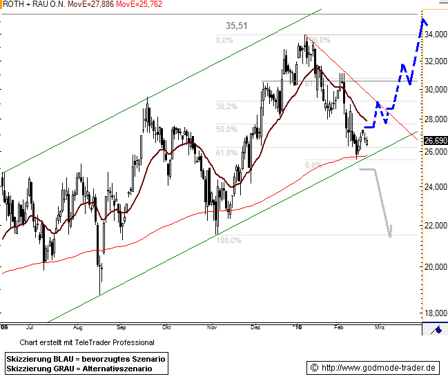 Rückblick: Die Kurse von Roth+Rau fielen in den vergangenen Wochen nach einem Rallyhoch bei 33,94 Euro bis auf die mittelfristige Aufwärtstrendlinie zurück. Diese Unterstützung wird zudem durch die exp. GDL 200 verstärkt und konnte der Aktie jüngst etwas Halt geben.